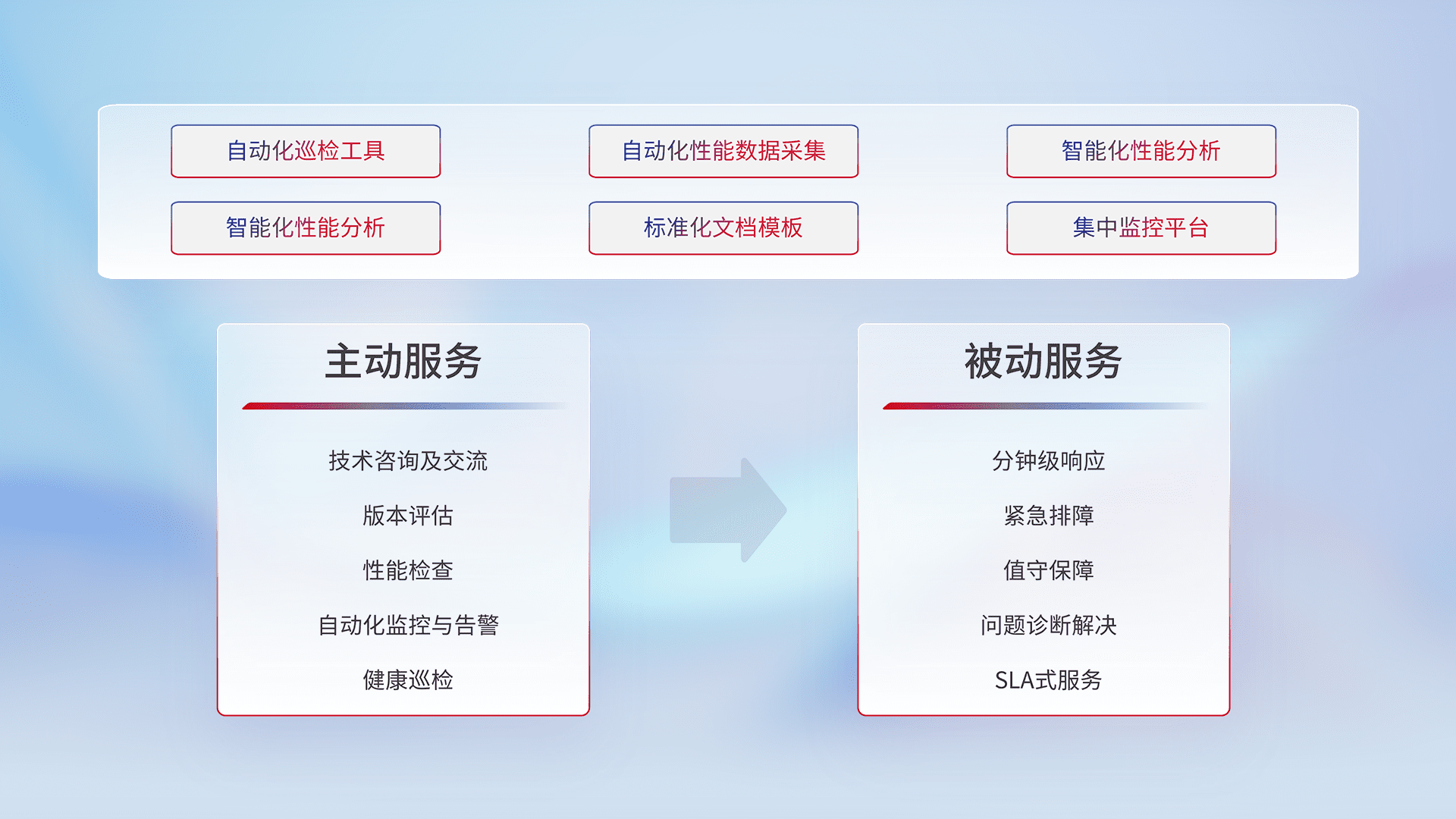 智能化工具和标准化文档,,保障服务质量,,,提供主动服务(包含技术咨询、、、版本评估、、、性能检查、、、自动化监控与告警、、健康巡检)和被动服务包含(分钟级响应、、紧急排障、、值守保障、、问题诊断解决、、SLA服务)。。